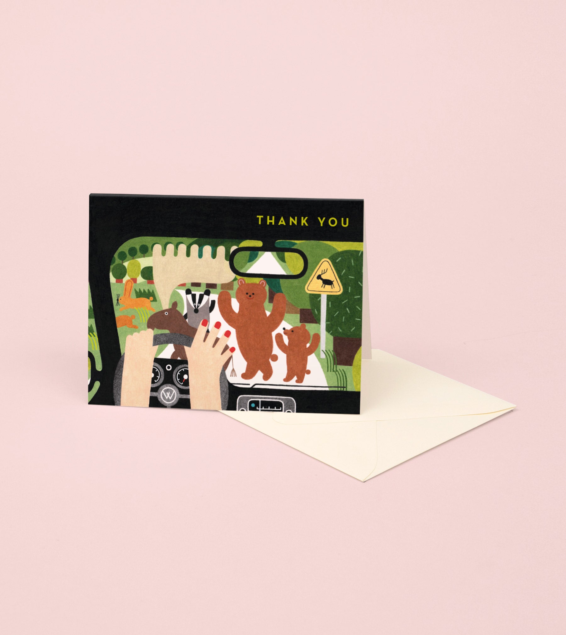 Express your gratitude with this delightful thank you card, featuring a patient driver waiting for woodland animals to cross the road, reminding you of the kindness that deserves appreciation.